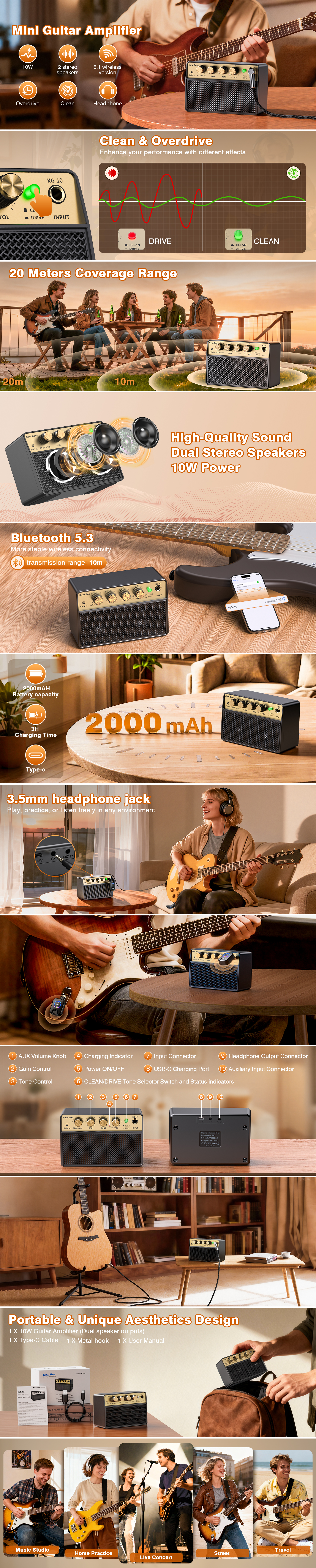 Experience the warmth of traditional sound. Engineered with pure analog circuitry, this 10W amplifier delivers a natural, responsive guitar tone that defies its compact size. With a wide frequency response and impressive projection, it provides enough volume to fill a room or a street corner, making it the perfect companion for bedroom practice, studio recording, or intimate busking.