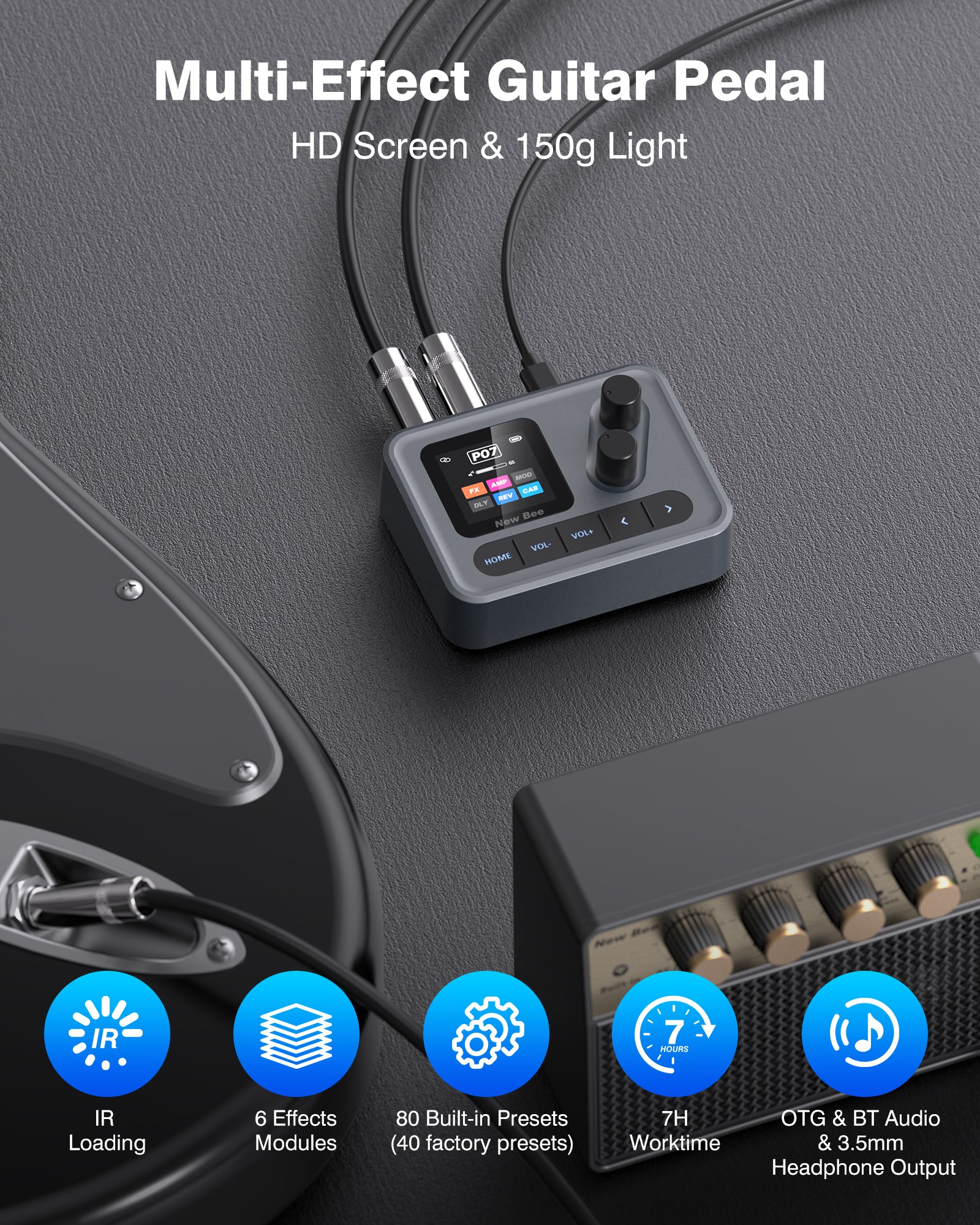 The guitar effects has 6 main modules (FX/AMP/MOD/DLY/REV/CAB) which can be rearranged freely; 80 presets (40 factory + 40 user defined), create your own unique sound, suitable for home practice, outdoor performance and stage performance.