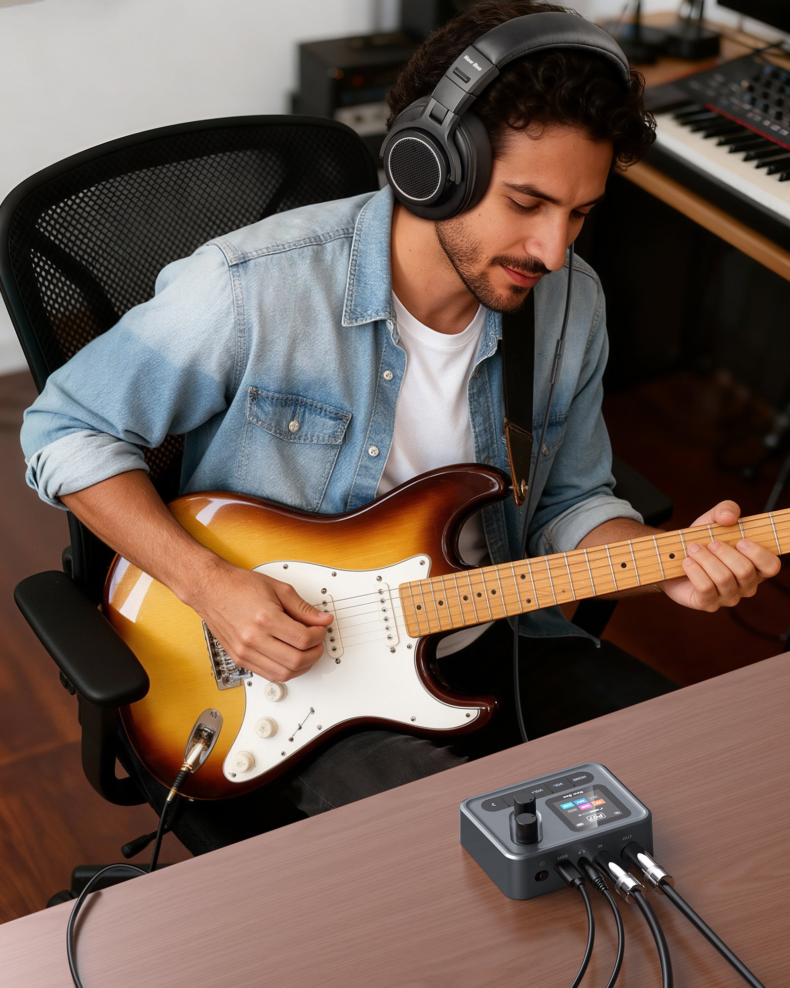 The electric guitar effects measures 93 × 72 × 41mm and weighs 150g, integrating the functions of “6 effects + amplifier head + speaker cabinet”. Equipped with a metal clip, it has a 1450 mAh battery with 7 hours of autonomy and can be recharged using an external battery, which saves musicians who are always on the move from having to carry heavy equipment.